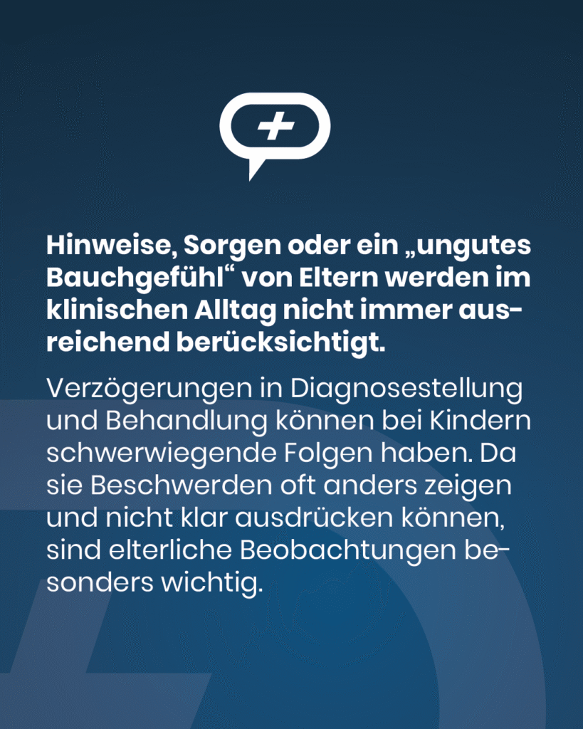Ein ungutes Bauchgefühl oder geäußerte Sorgen von Eltern sind wichtige Hinweise im klinischen Alltag. Werden diese ernst genommen, können Verzögerungen in Diagnosestellung und Behandlung vermieden und die Sicherheit der Kinder verbessert werden.